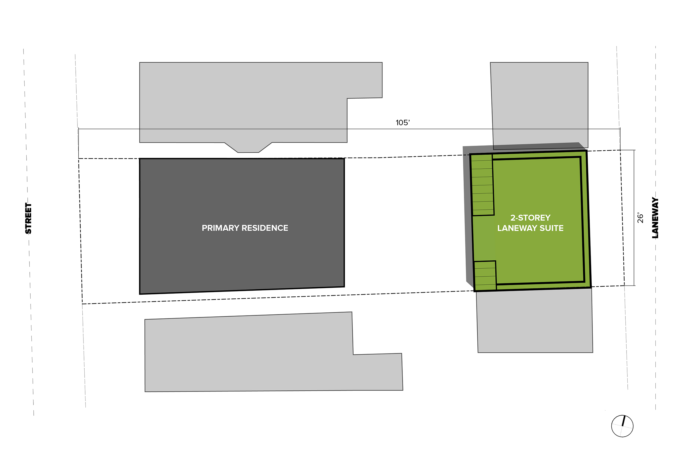 The Bickford Park Laneway Suite is situated in Toronto’s west end, footsteps from the Bloor West corridor. The primary goal of this development was to densify an existing large lot to maximize the amount of useable floor area for future tenants both in the main home and secondary dwelling. On the exterior, windows are sized and oriented to optimize solar performance and control overlook. The interior of the laneway suite utilizes an open concept floorplan with living, dining, kitchen, den, and powder room at grade while maintaining privacy by locating two large bedrooms with dedicated ensuites on the upper floor. The laneway facade is designed as a canvas to host a dramatic mural by local graffiti artist, Chris Perez, in an effort to both embrace and enhance the unique character of Toronto’s laneway typology.