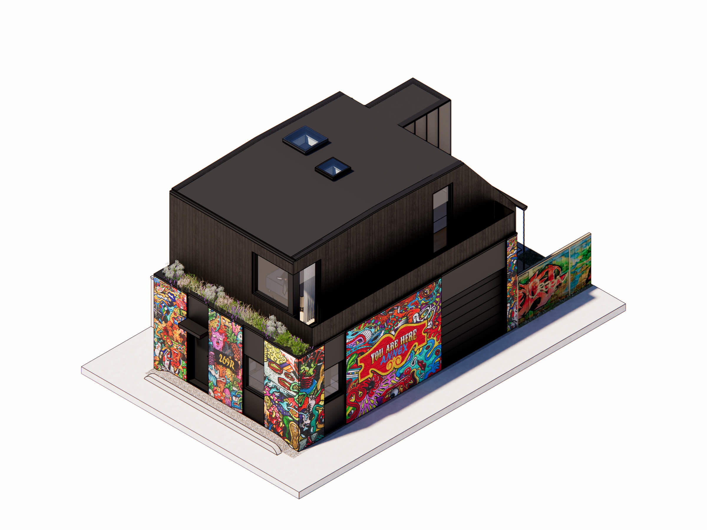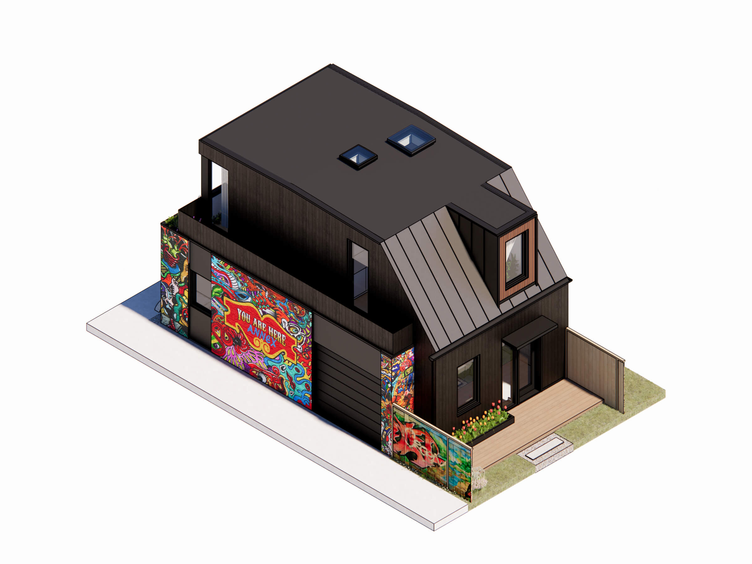 Where art and laneway suites collide! This 1,200 square-foot laneway suite expands upon an existing garage structure whose original mural commemorated the infamous Honest Ed’s. This second-floor top-up houses both a single-car garage and an open-concept living/kitchen/dining off of the laneway. The upper level hosts a shared three-piece bath with two bedrooms, one complete with a study nook and the other with a walk-in-closet. Large East and West facing windows and North side juliette windows pull natural light into the space, and the second floor addition is clad in a subdued charred wood siding, leaving the beauty of the ground-floor mural to shine!