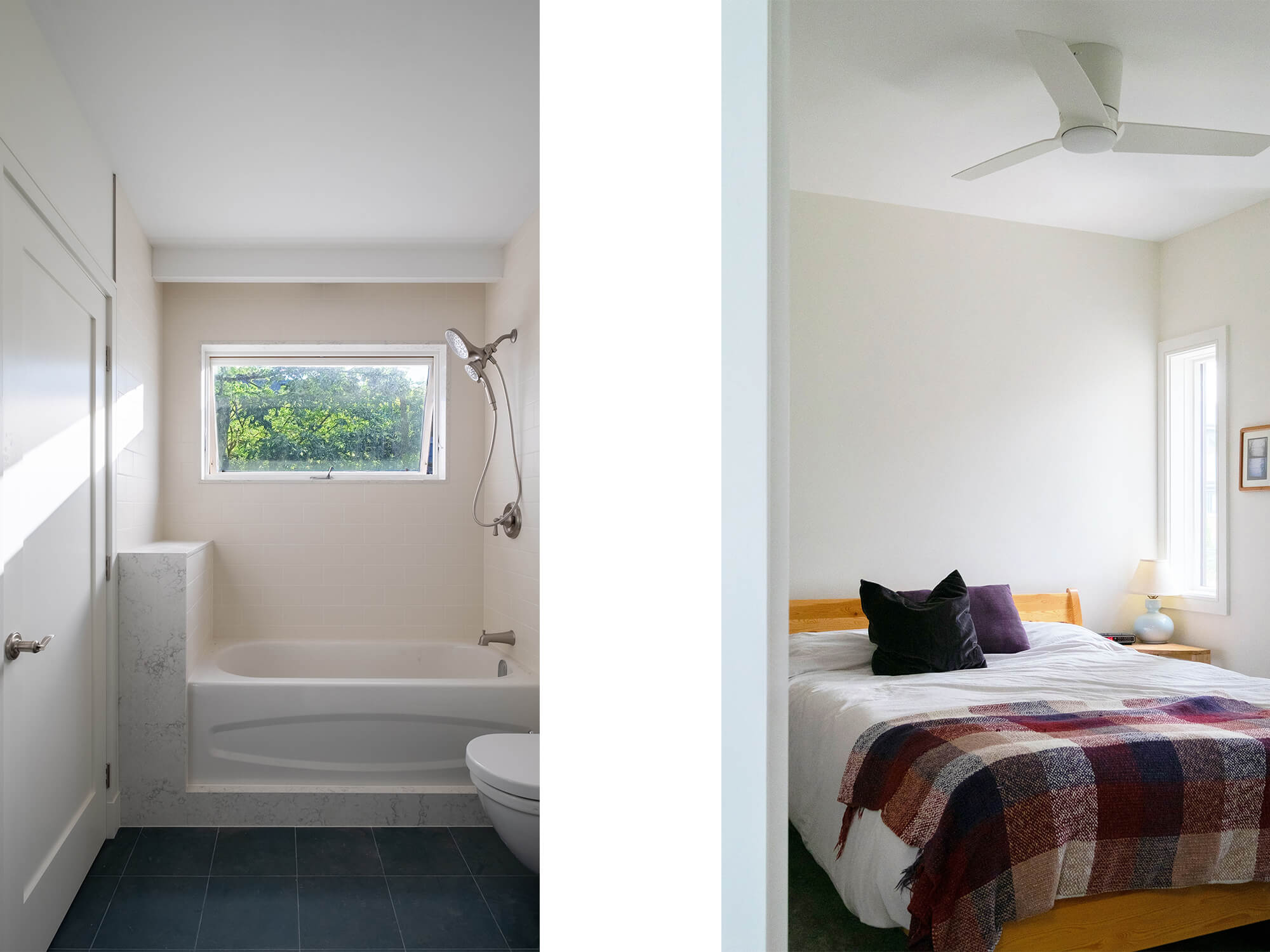 This meticulously designed 2-storey, 970 square-foot suite featuring two bedrooms and one bath is intended to become the new residence for the homeowners. The ground floor seamlessly integrates a warm and inviting open-concept layout, merging the dining, kitchen, and living areas to optimize every inch of space. The upper level reveals two thoughtfully appointed bedrooms and an office den, strategically oriented to maximize views of both the lane and rear yard. The introduction of bay windows serves as a defining element, equipping these bedrooms with an abundance of natural light and offering a unique connection to the surroundings. These windows play a dual role by not only illuminating the interior but also contributing to the architectural allure of the building’s facade.