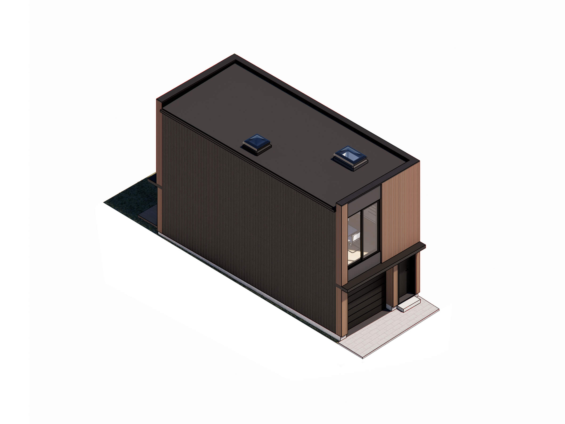 The owners of this deep, narrow property sought to leverage their laneway to generate rental income. This 900 square foot two storey suite hosts a single car garage/storage space with den off of the rear yard at grade and a self contained single bedroom unit on the second level. The building is clad in a two tone scheme that accentuates the building’s geometry with castellated wood paneling and black fiber cement panel siding, fitting perfectly into place with the existing home on the property.