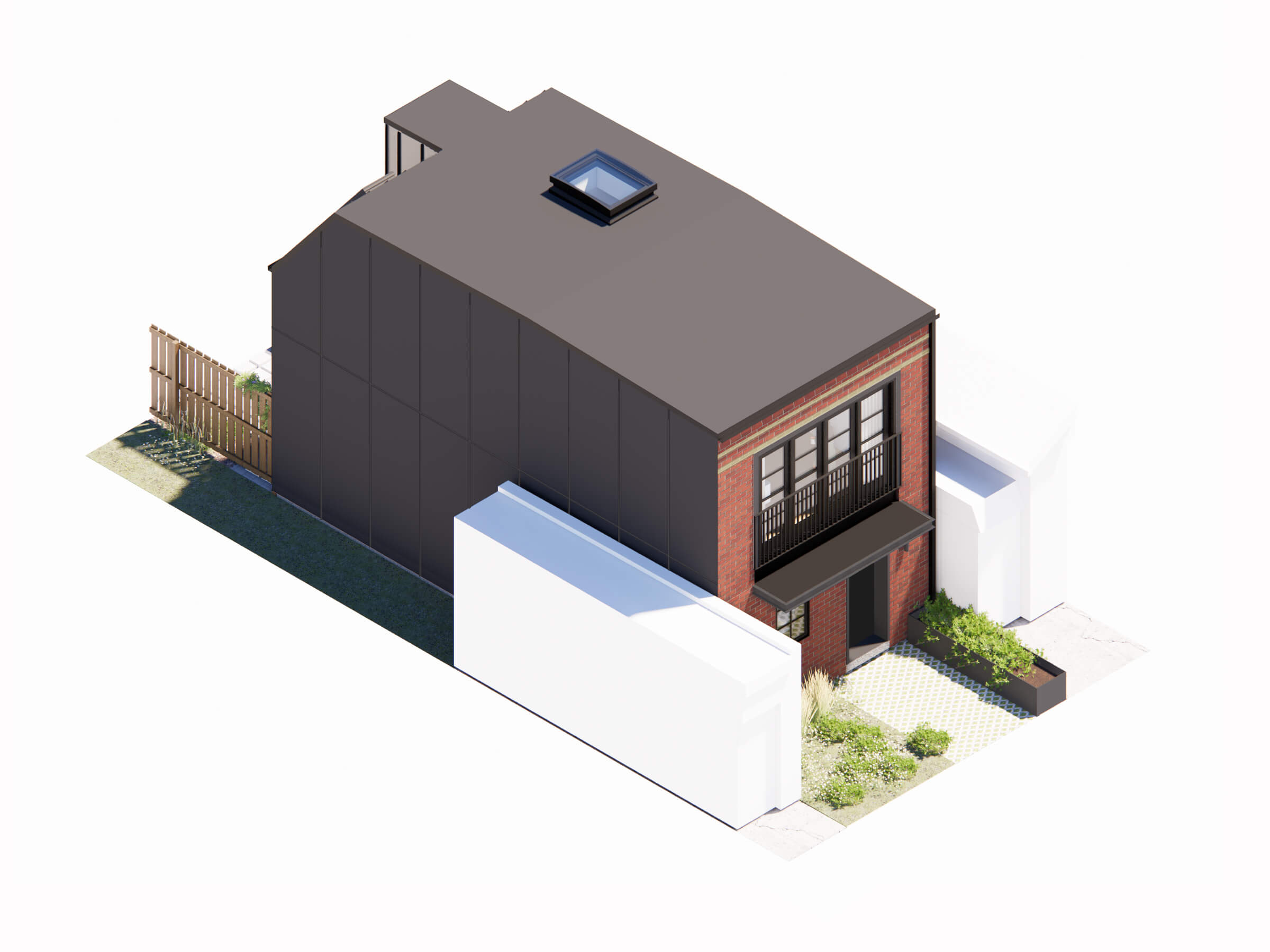 The 1000 square-foot Little Italy Laneway Suite is a spacious two-storey home. The open concept ground floor is paired with two bedrooms on the second floor, each with their own full ensuite bathrooms and views to the garden or the lane. Clad in traditional red-brick with playful details, the traditional suite pairs well with the main house on the property.