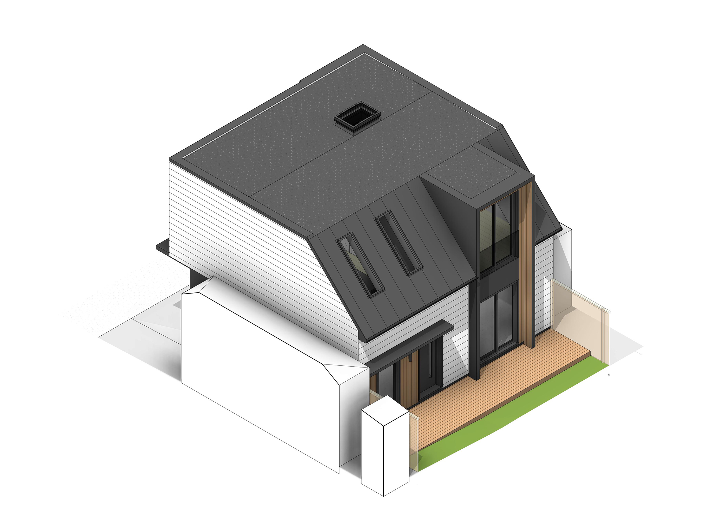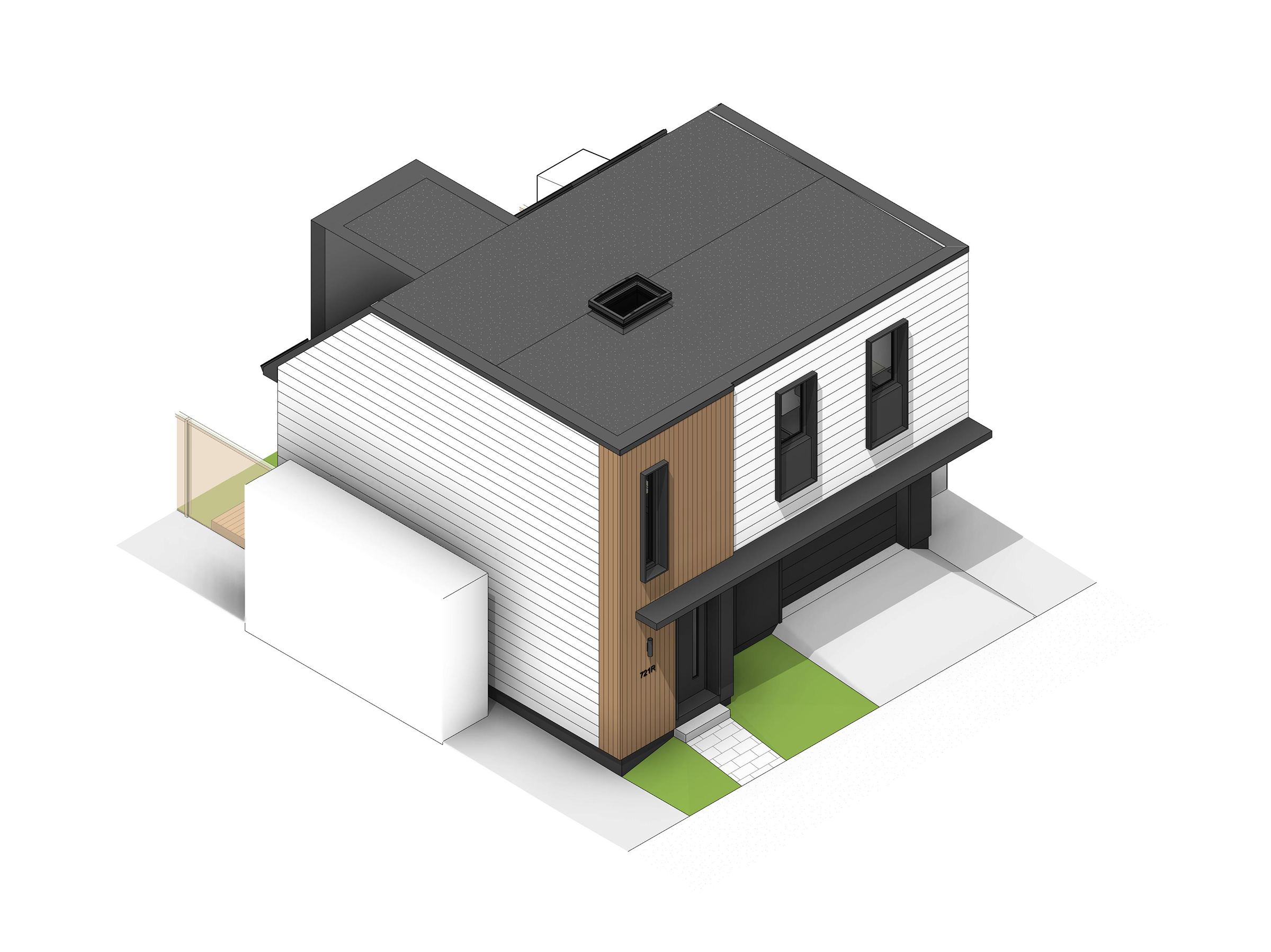 This 900 square foot, super-efficient laneway suite will provide the homeowner’s mother with a long-term space to age in place while maintaining housing flexibility for the family currently occupying the main house. A single car garage and multi-purpose office space occupy the ground level alongside a compact three-piece bathroom. A single bedroom living space at the second floor is accessed from the laneway via a private entry vestibule giving way to an open concept living space featuring all the comforts of home. Working closely with the homeowner, the Runnymede Laneway Suite melds contemporary geometry and detailing with traditional claddings to embrace a transitional aesthetic that compliments the main house and neighbourhood at large. With strategic investments in a well insulated, air-tight envelope in addition to an all-electric heating and cooling system, this build aims to minimize the building’s carbon footprint while future-proofing for net-zero energy consumption.